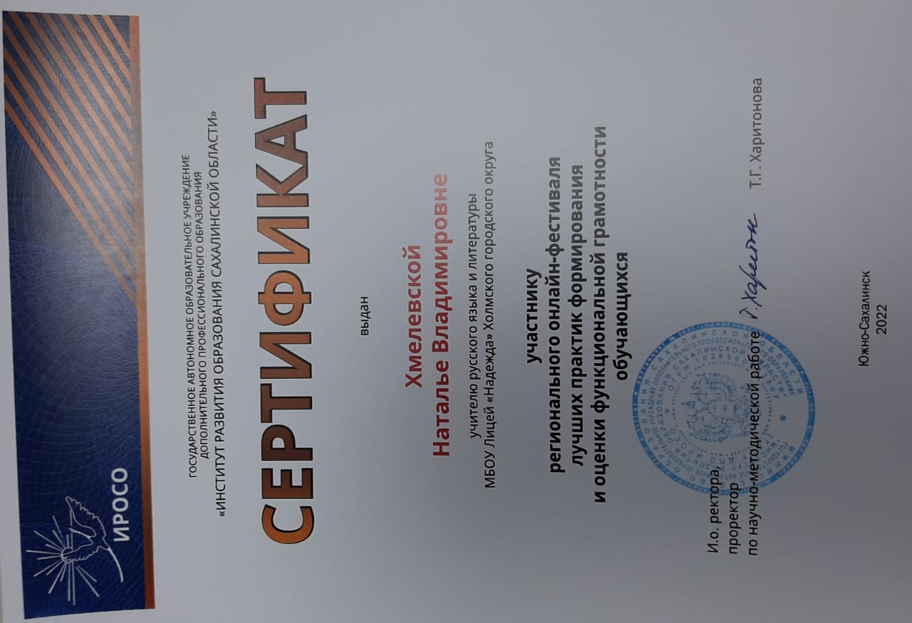 Сертификат участника регионального онлайн-фестиваля лучших практик формирования и оценки функциональной грамотности учащихся