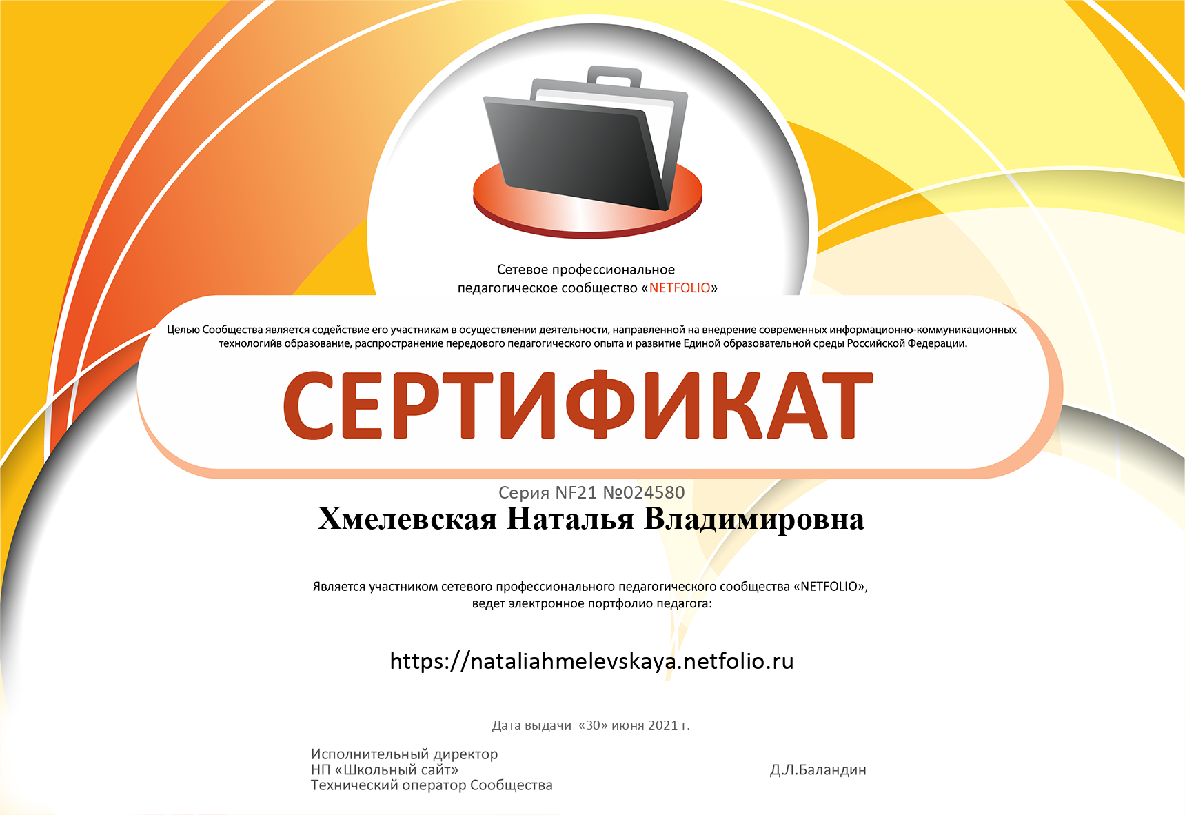 Сертификат сетевого сообщества NETFOLIO