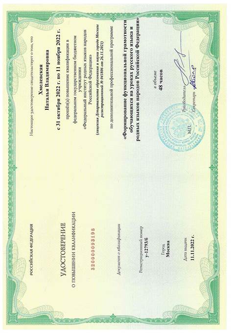 Удостоверение о прохождении курсов повышения квалификации "Формирование функциональной грамотности на уроках русского языка"