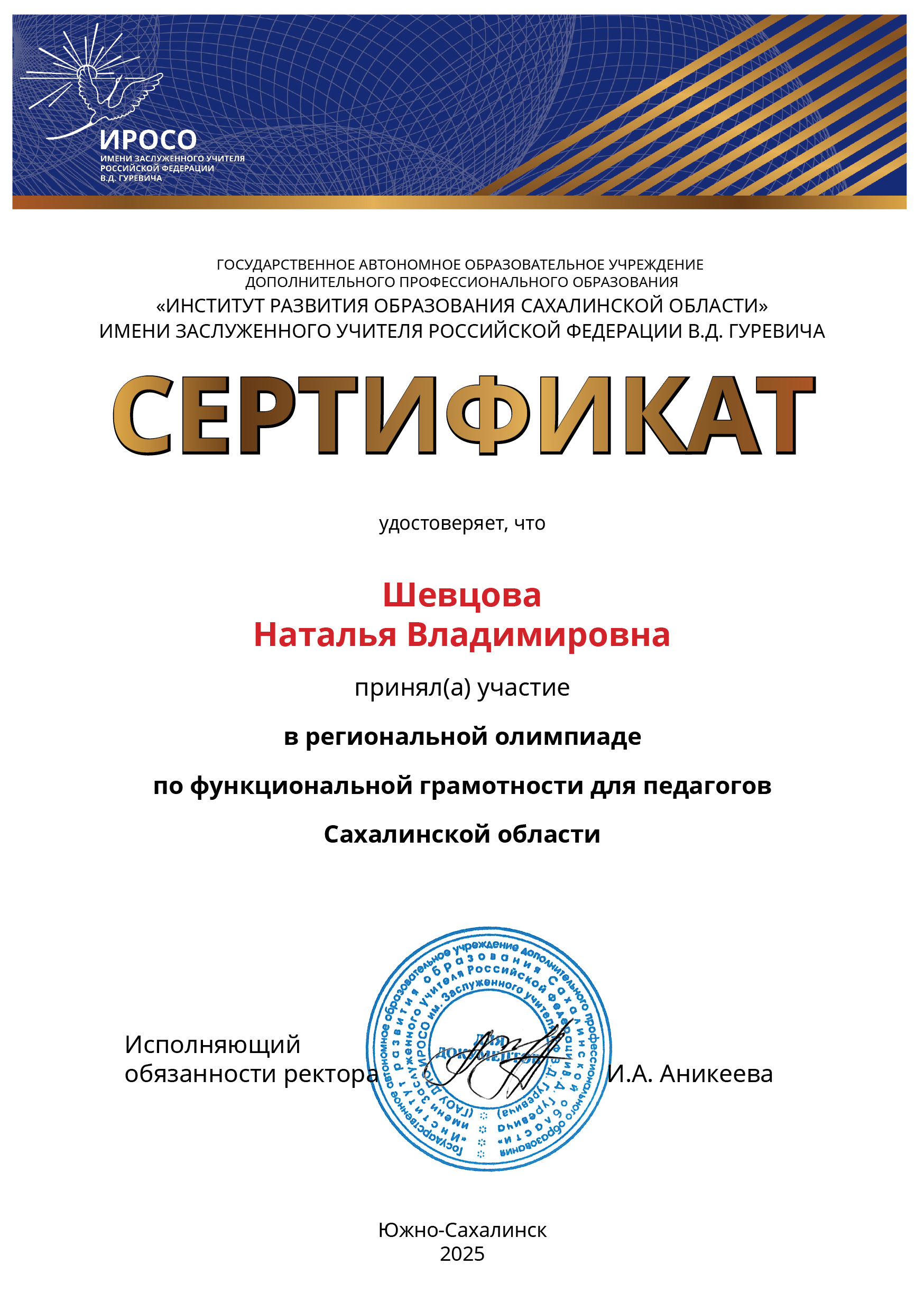 Сертификат участия в Региональной олимпиаде по финансовой грамотности. 2025.