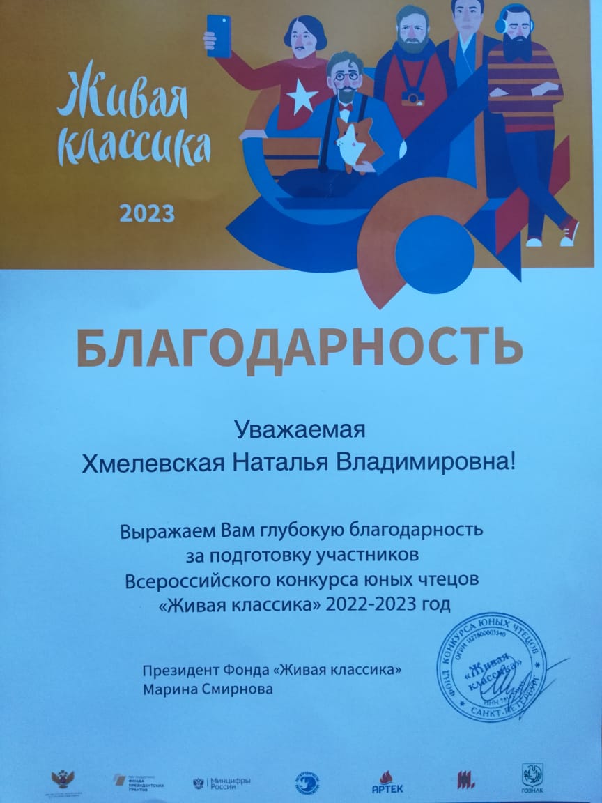 Благодарность за подготовку участников Всероссийского конкурса "Живая классика"