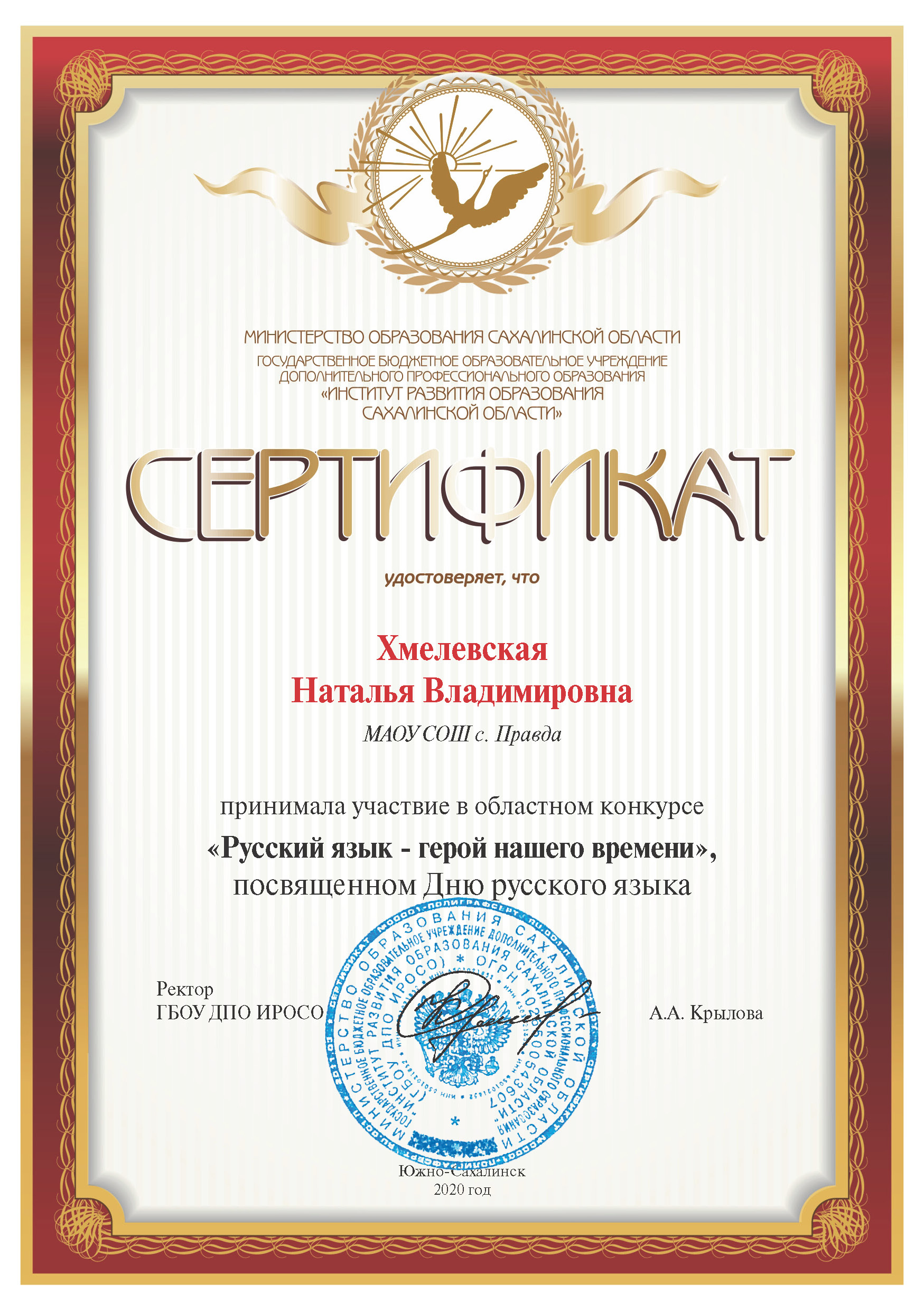 Сертификат участия в областном семинаре для педагогов Сахалинской области, занимающихся подготовкой детей к олимпиадам по русскому языку