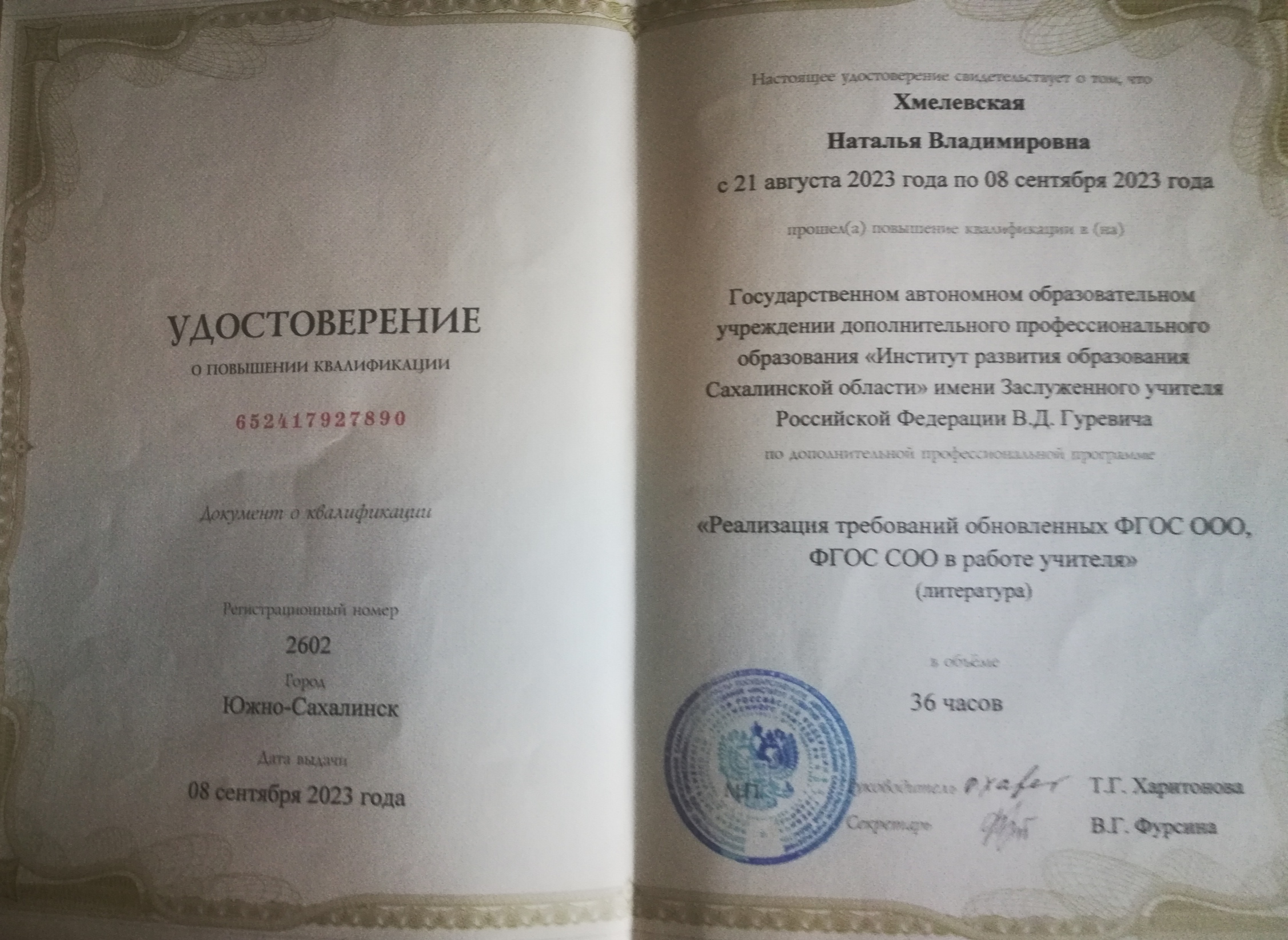 Удостоверение о прохождении курсов повышения квалификации по дополнительной профессиональной программе "Реализация требований обновленных ФГОС ООО, ФГОС СОО в работе учителя русского языка", 2023