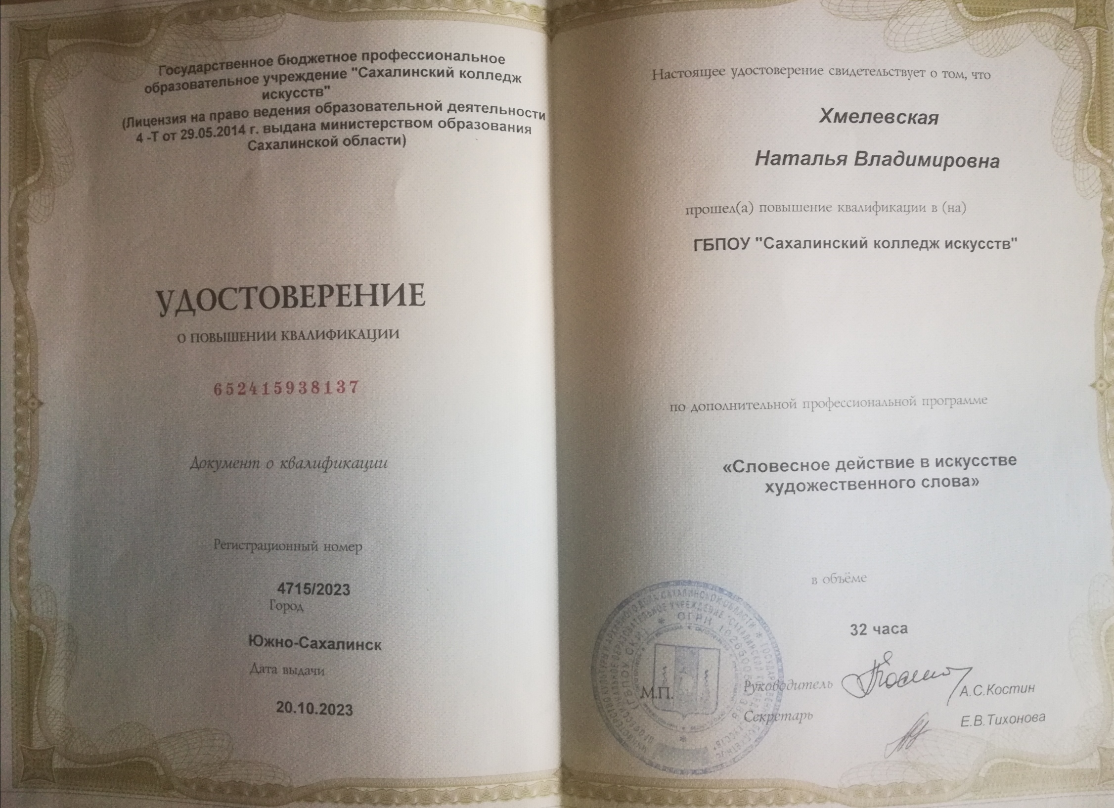 Удостоверение о курсах повышения квалификации по дополнительной профессиональной программе "Словесное действие в искусстве художественного слова", 2023 г.