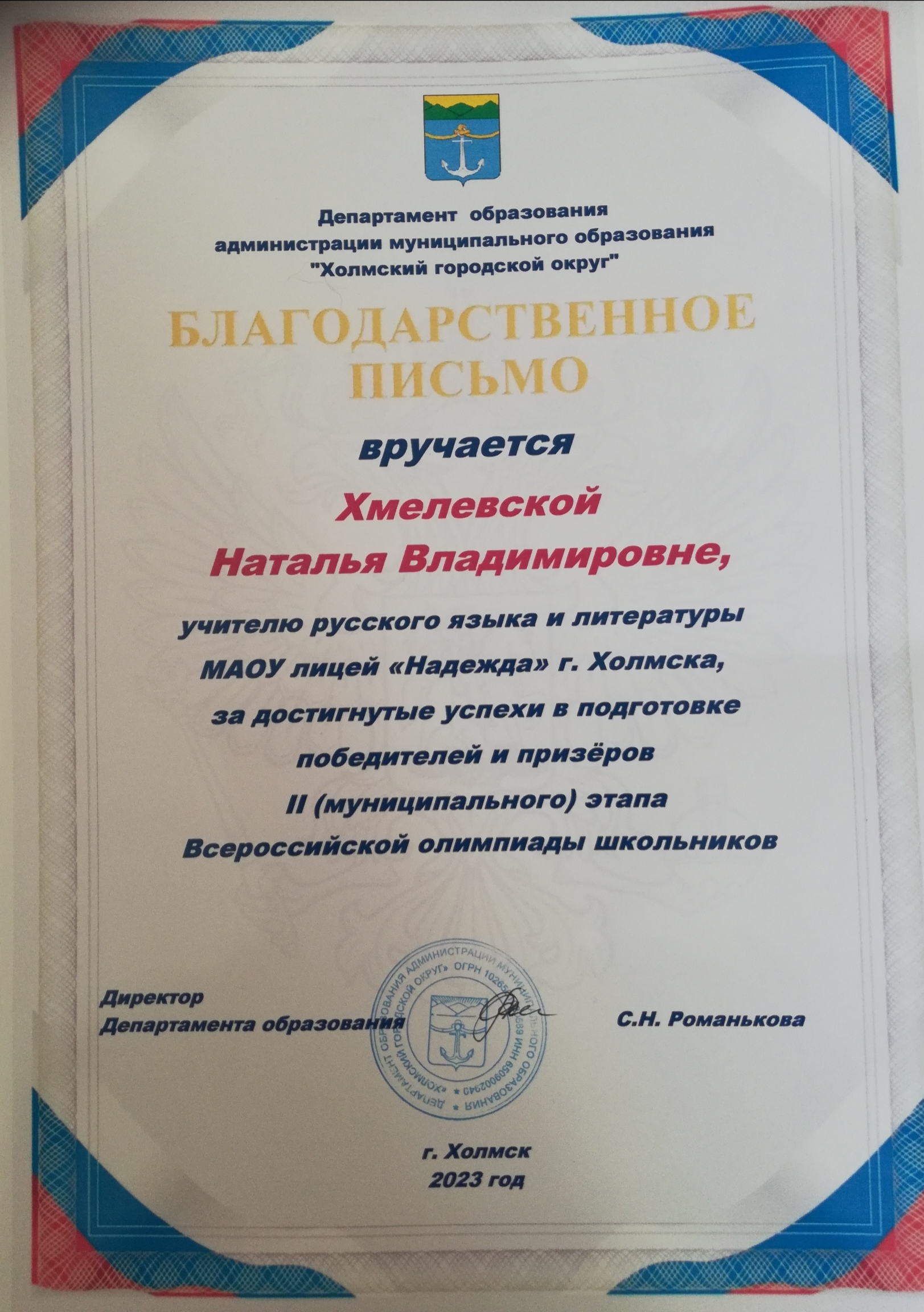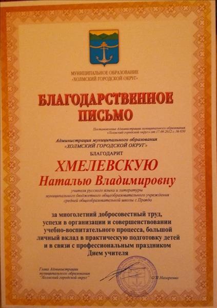 Грамота Управления образования МО "Холмский городской округ" за добросовестный труд и личный вклад в развитие образования Холмского городского округа...