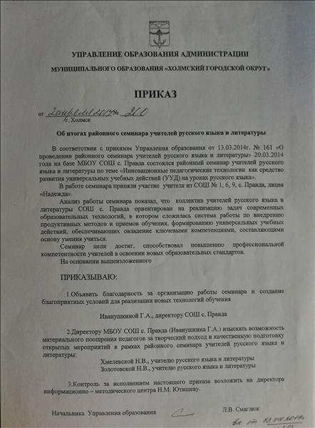 Приказ "Об итогах районного семинара учителей русского языка и литературы" начальника УО администрации муниципального образования "Холмский городской округ" Л.В. Смаглюк от 2 апреля 2014 года