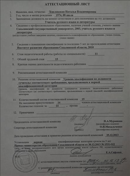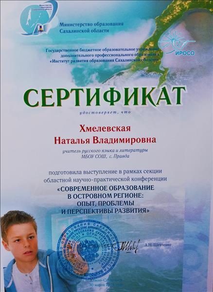 Диплом ИВС 0189312. Решением государственной аттестационной комиссии САХГУ г. Южно-Сахалинска 4 июня 2003 года Хмелевской Наталье Владимировне присуждена квалификация "Учитель русского языка и литературы" по специальности "Филология".
