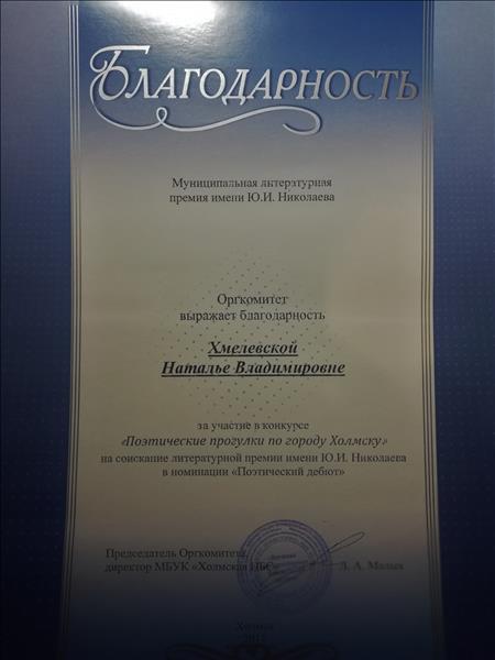 Благодарность за участие в муниципальном поэтическом конкурсе "Поэтические прогулки по городу Холмску". 2017 г.