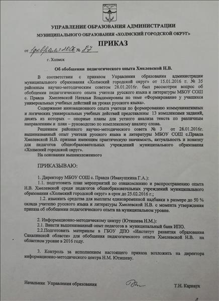 Приказ "Об обобщении педагогического опыта Хмелевской Н.В." (на МУНИЦИПАЛЬНОМ УРОВНЕ). 2016 год.