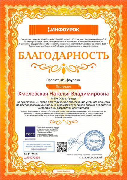 Благодарность проекта "Инфоурок".