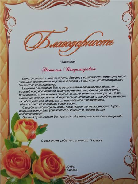 Благодарность. Родители выпускников 11 класса МАОУ СОШ с. Правда, 2018 г.