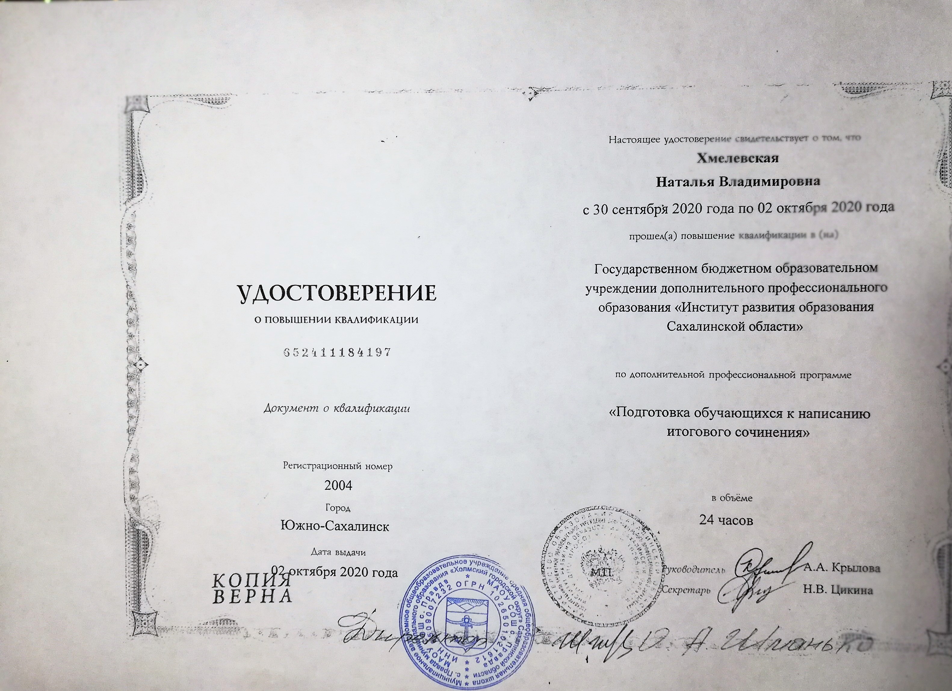 (ГБОУ ДПО "Институт развития образования Сахалинской области". 24часов. Форма обучения: очная.).