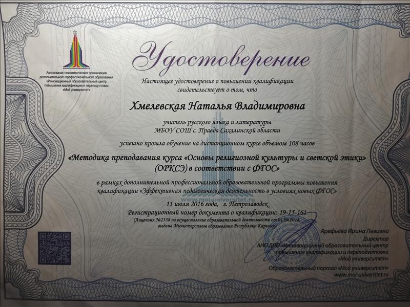 (Государственное автономное образовательное учреждение дополнительного профессионального образования "Институт развития образования Сахалинской области" имени В.Д. Гуревича". 36часов. Форма обучения: заочная. Направленность: методика преподавания предмета).