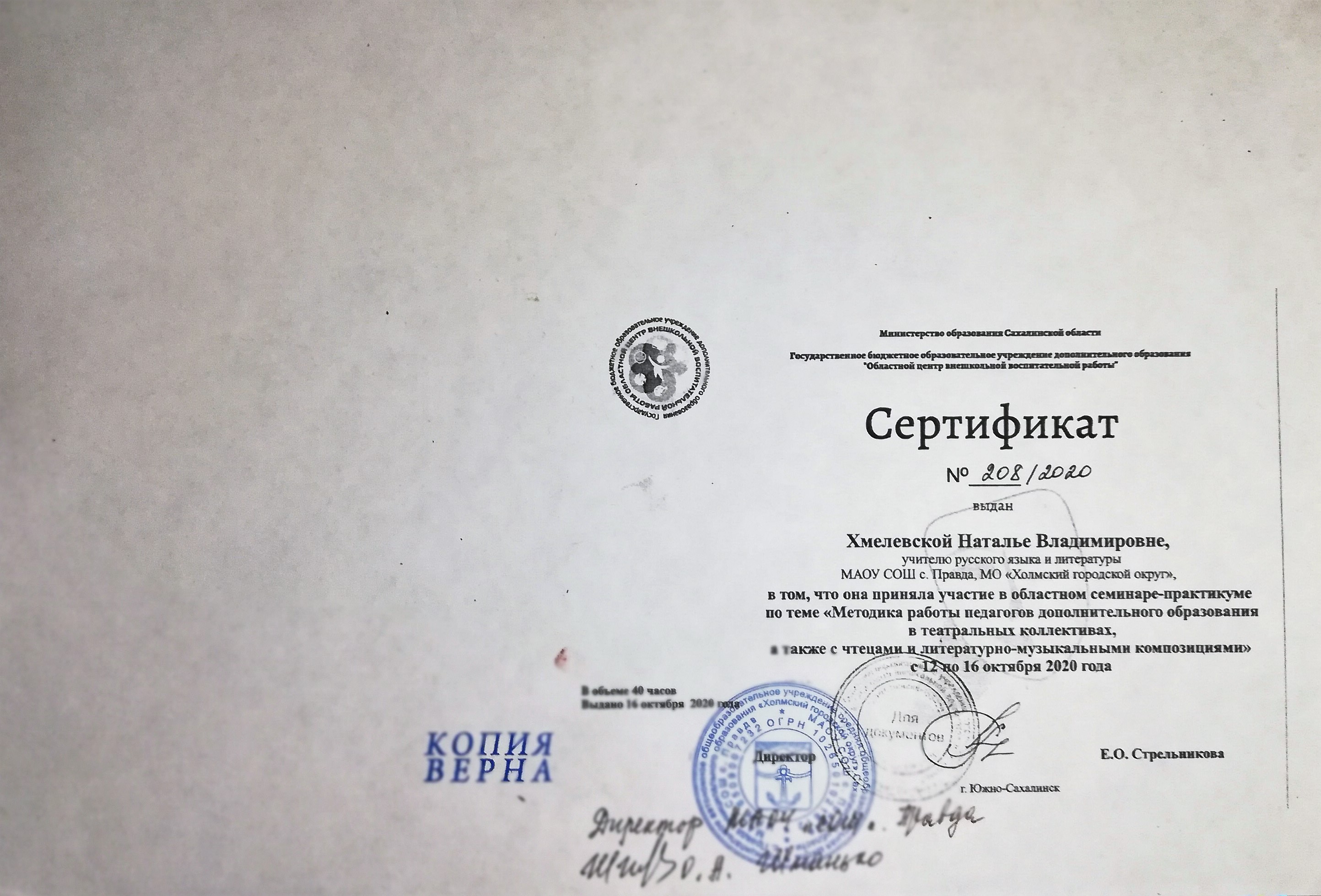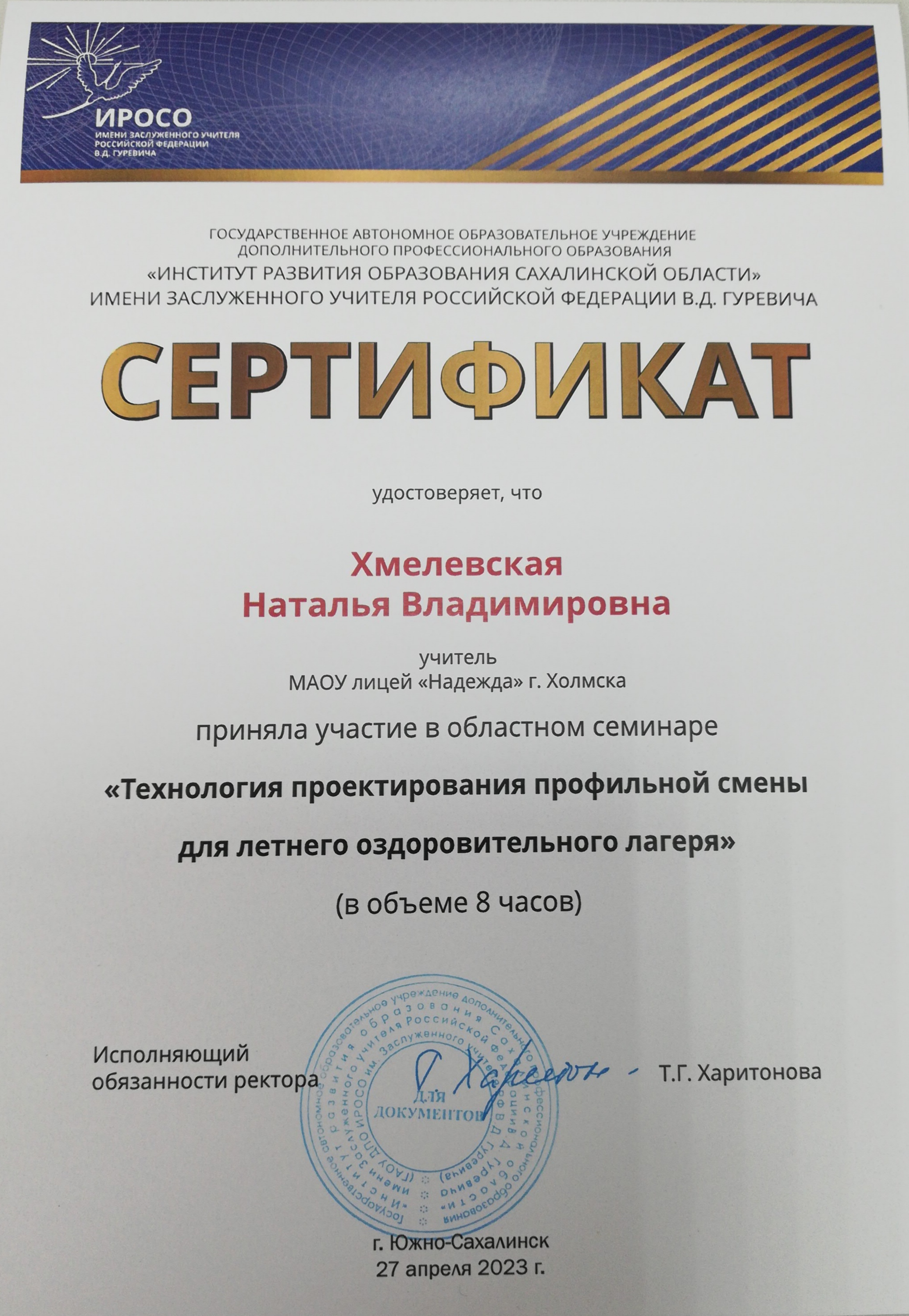 (ГБОУ ДПО "Институт развития образования Сахалинской области". 8 часов. Форма обучения: очно.).